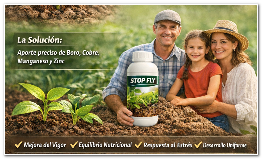 No se trata solo de aplicar micronutrientes, sino de hacerlo en la proporción correcta. Un exceso de uno puede bloquear la absorción de otro. Por eso, soluciones equilibradas como STOP FLY son tan efectivas: aportan Boro, Cobre, Manganeso y Zinc en una relación diseñada para corregir carencias sin generar desequilibrios.